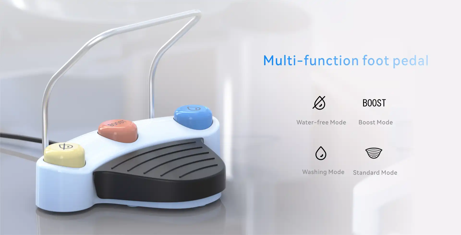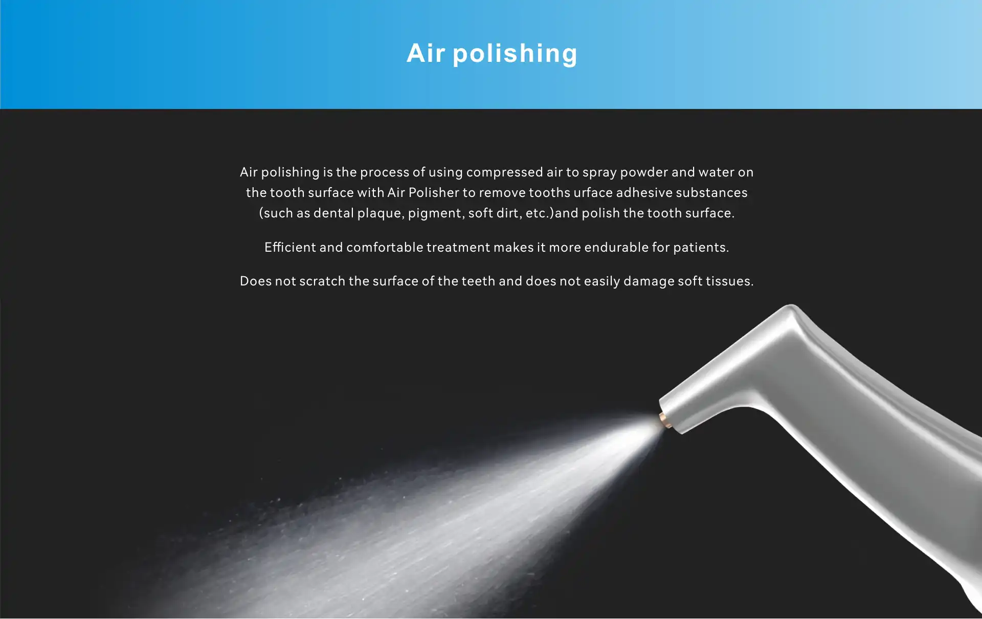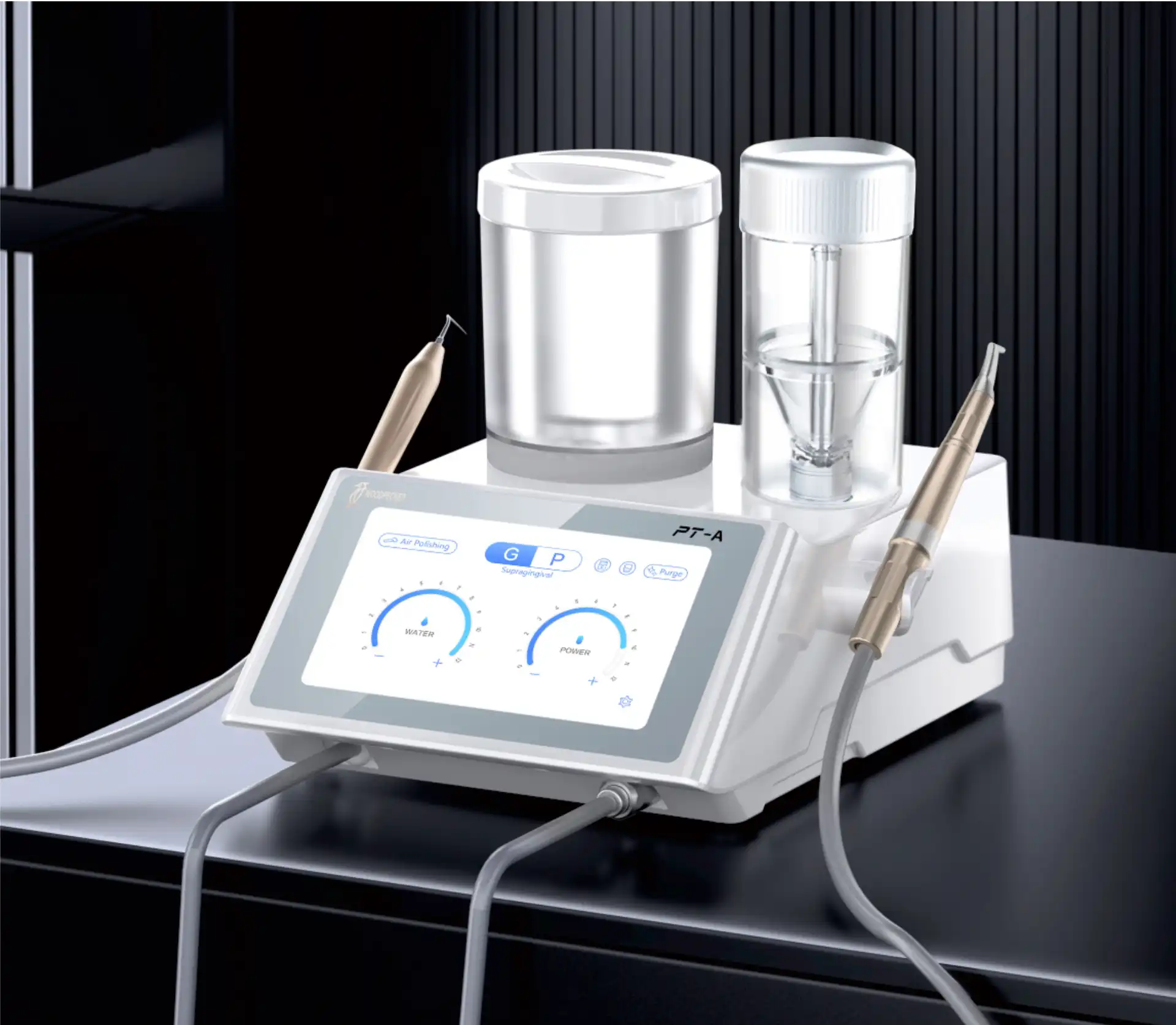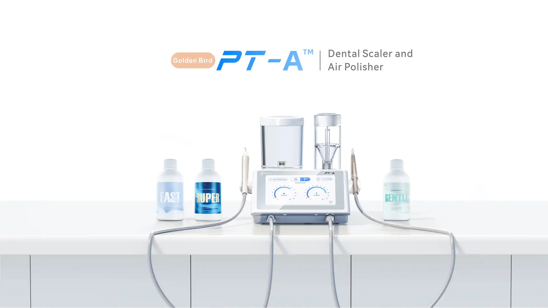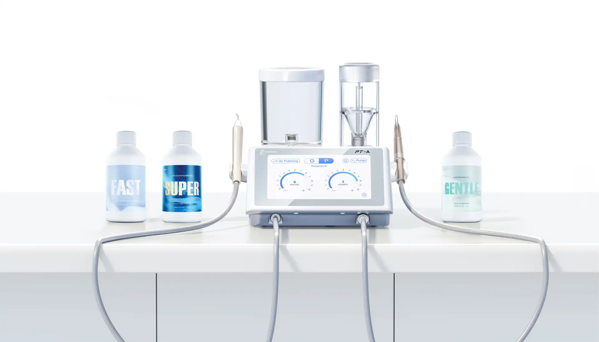The Woodpecker PT-A is 2 in 1 smart system which contain Air Polishing and Scaling, also has an easy to understand and adjust touch screen display. The PT-A is your complete prophylaxis solution. Air polishing uses compressed air to spray powder and water on the tooth surface to remove surface adhesives such as plaque. It is comfortable for the patient, powerful and does not scratch the tooth surface. The PT-A has dual water supply bottles and a multi function foot pedal.